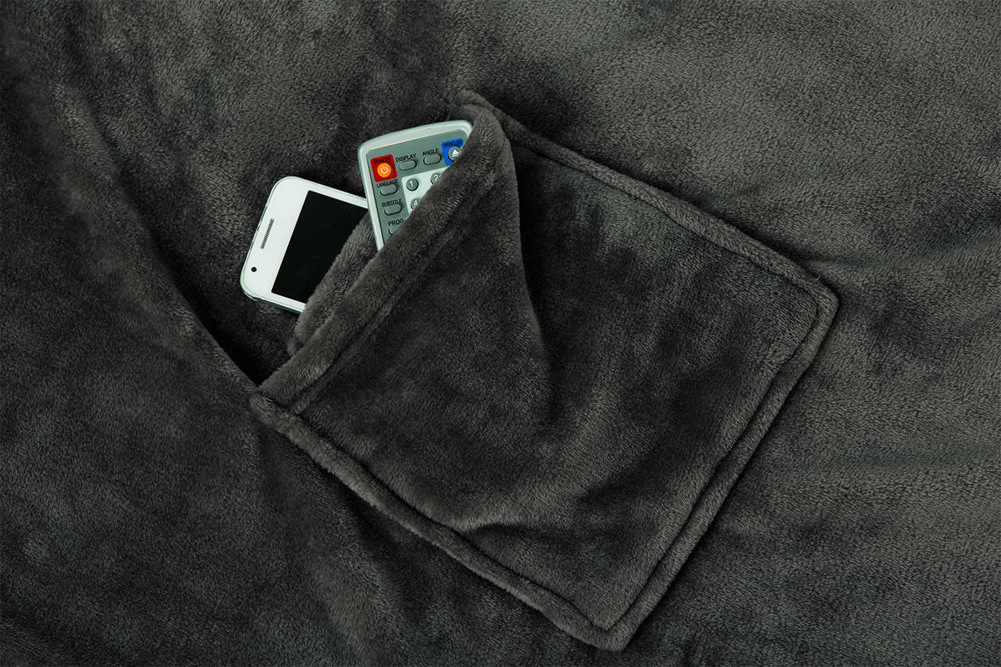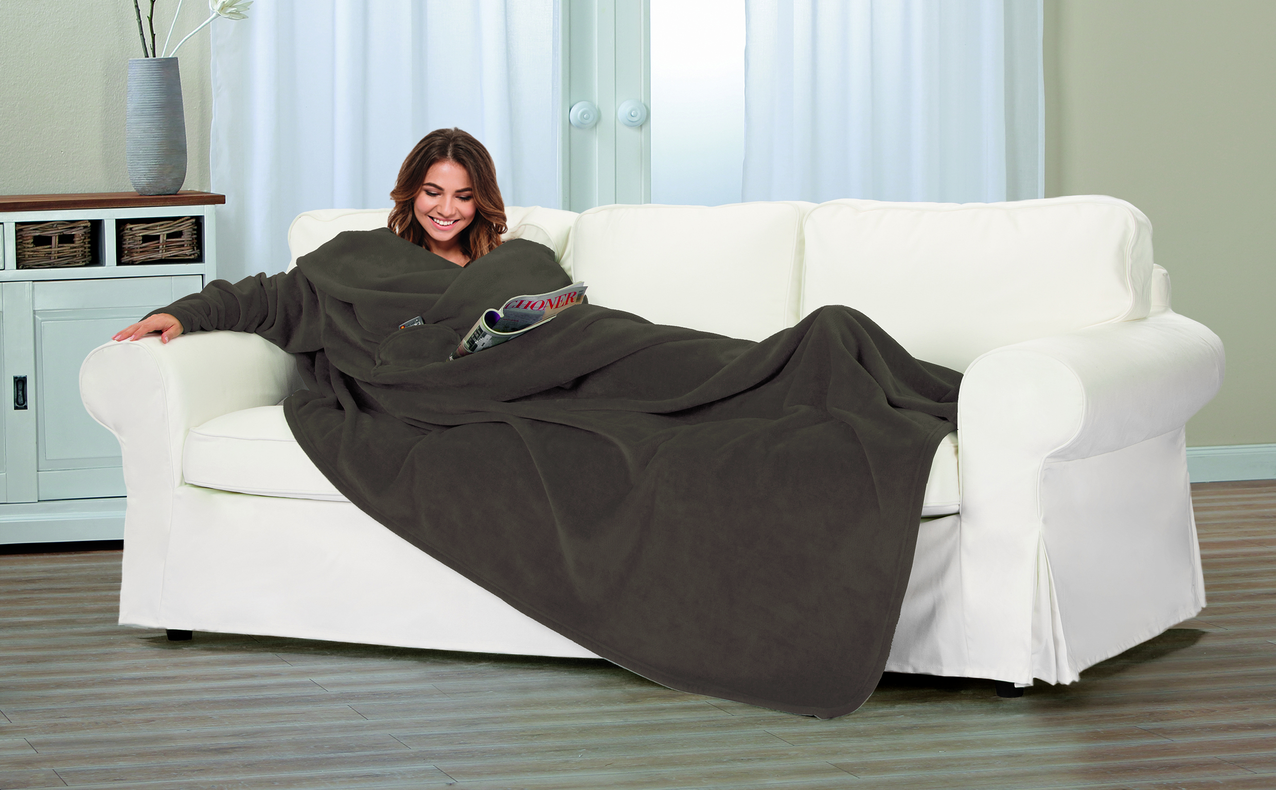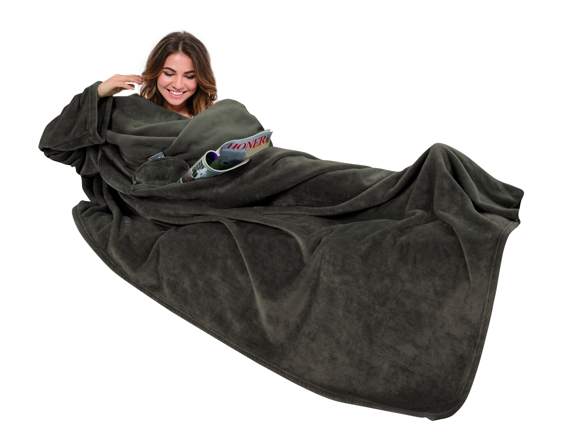 Flauschige Kuscheldecke mit Ärmel (150 x 240 cm). Ideal zum Einkuscheln auf dem Sofa für gemütliche Fernsehabende. Einfaches Einhüllen durch großzügige Ärmel. Die Decke bietet dank der Brusttasche ausreichend Platz für das Handy, eine Fernbedienung und vieles Weitere.