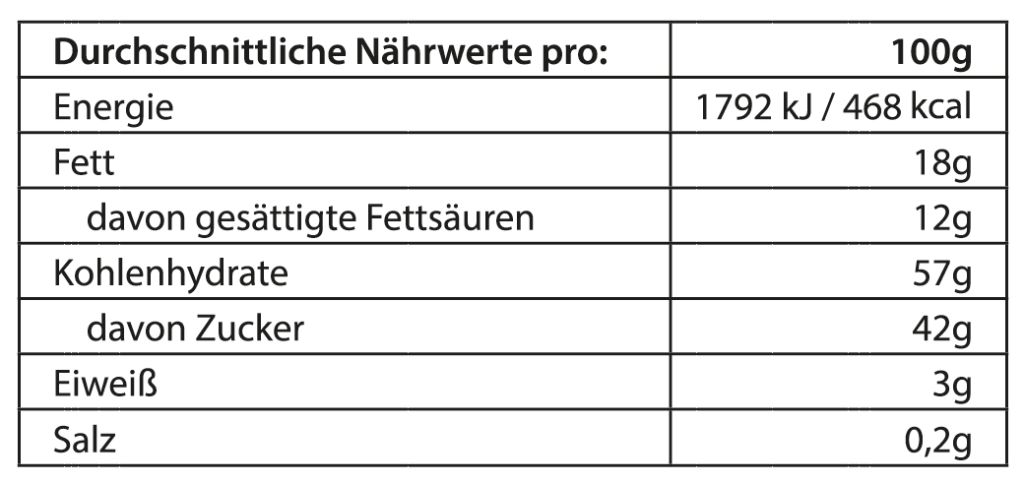 Zutaten: Kokosblütenzucker (46%), Schokolade dunkel (25%), (Rohrohrzucker, Kakaomasse, Kakaobutter).