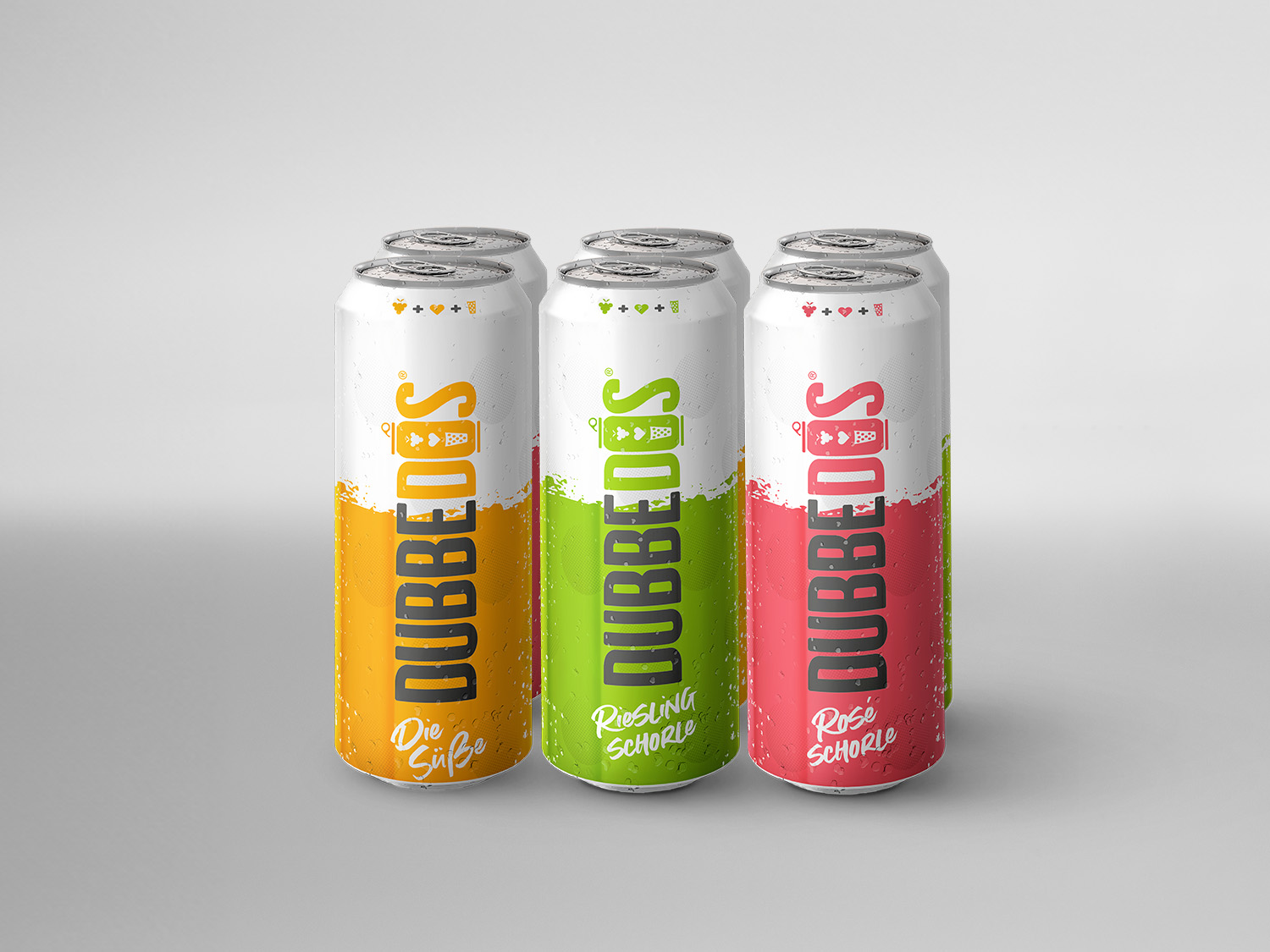 6er-Probier-Paket mit je 2 Dosen Riesling- und Rosé-Schorle sowie je 2 Dosen Die Süße in der 0,5l DUBBEDOS.