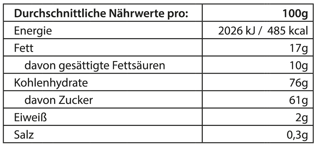 Zutaten: Rohrohrzucker, Glukose, Sahne, Peru Edel-Schokolade dunkel (15%) (Rohrohrzucker, Kakaomasse, Kakaobutter), Peru Edel-Schokolade Vollmilch (9%) (Rohrohrzucker, Kakaomasse, Kakaobutter, Vollmilchpulver) Kakao: mind. 41% in der Schokolade, Eierlikör (11%), Butter, Haselnusskrokant (3,8%), Salz.
