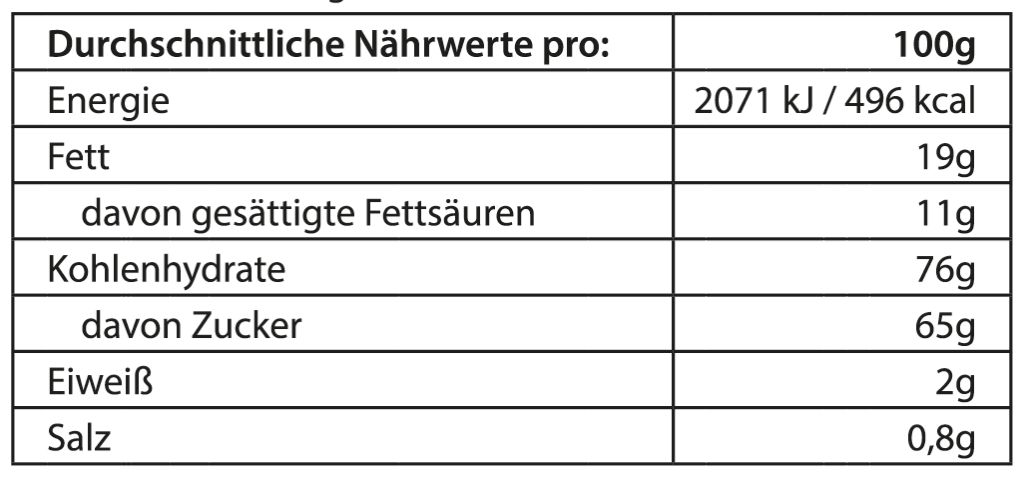 Zutaten: Rohrohrzucker, Sahne, Glukose, Peru Edelschokolade dunkel (15%) (Rohrohrzucker, Kakaomasse, Kakaobutter), Peru Edelschokolade Vollmilch (9%) (Rohrohrzucker, Kakaomasse, Kakaobutter, Vollmilchpulver) Kakao: mind. 41% in der Schokolade, Butter, Meersalzflocken (0,77%).