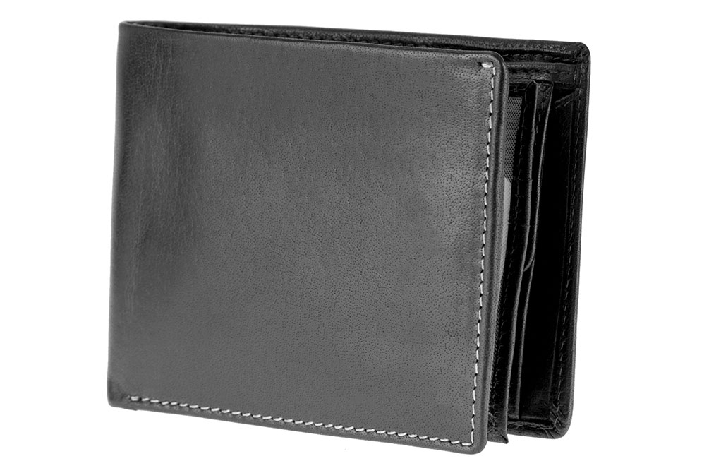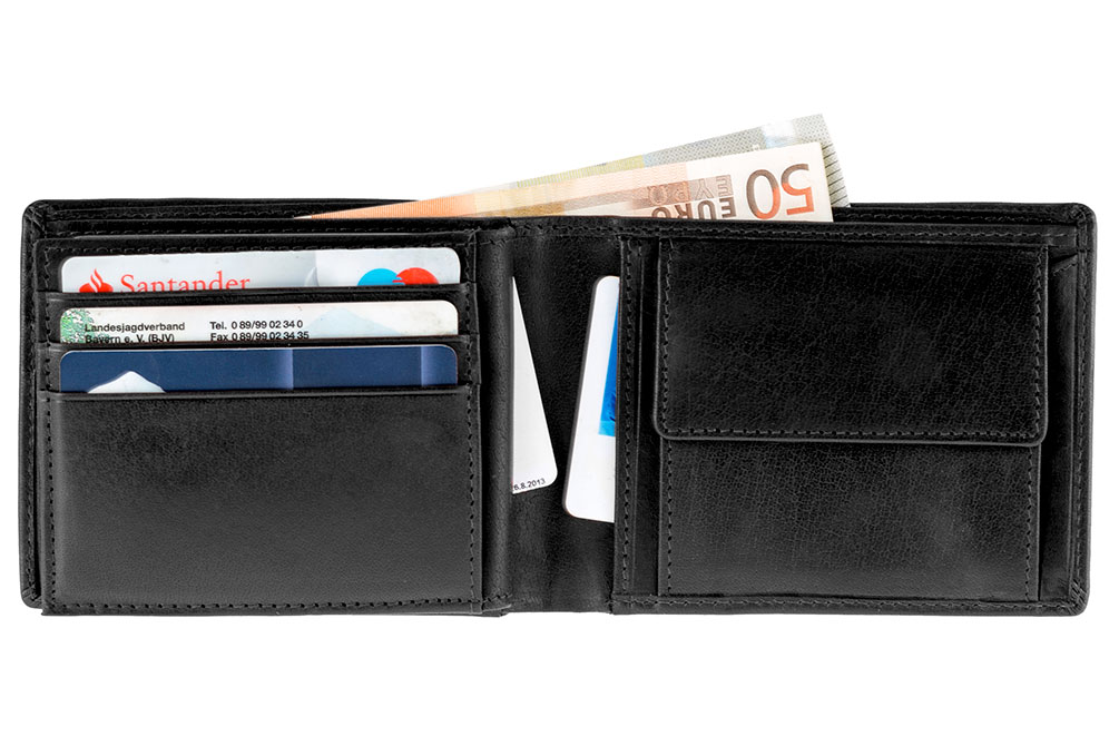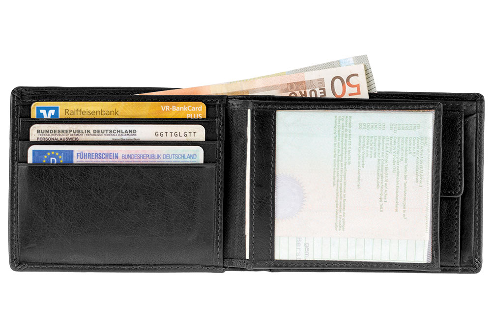 Darüber hinaus bietet der Geldbeutel sechs Steckfächer im Geldkarten-Format und drei Einschubfächer im Format 77 x 100 mm davon eines mit Sichtfenster für zum Beispiel Firmenausweise oder Monatskarten vom ÖPNV.