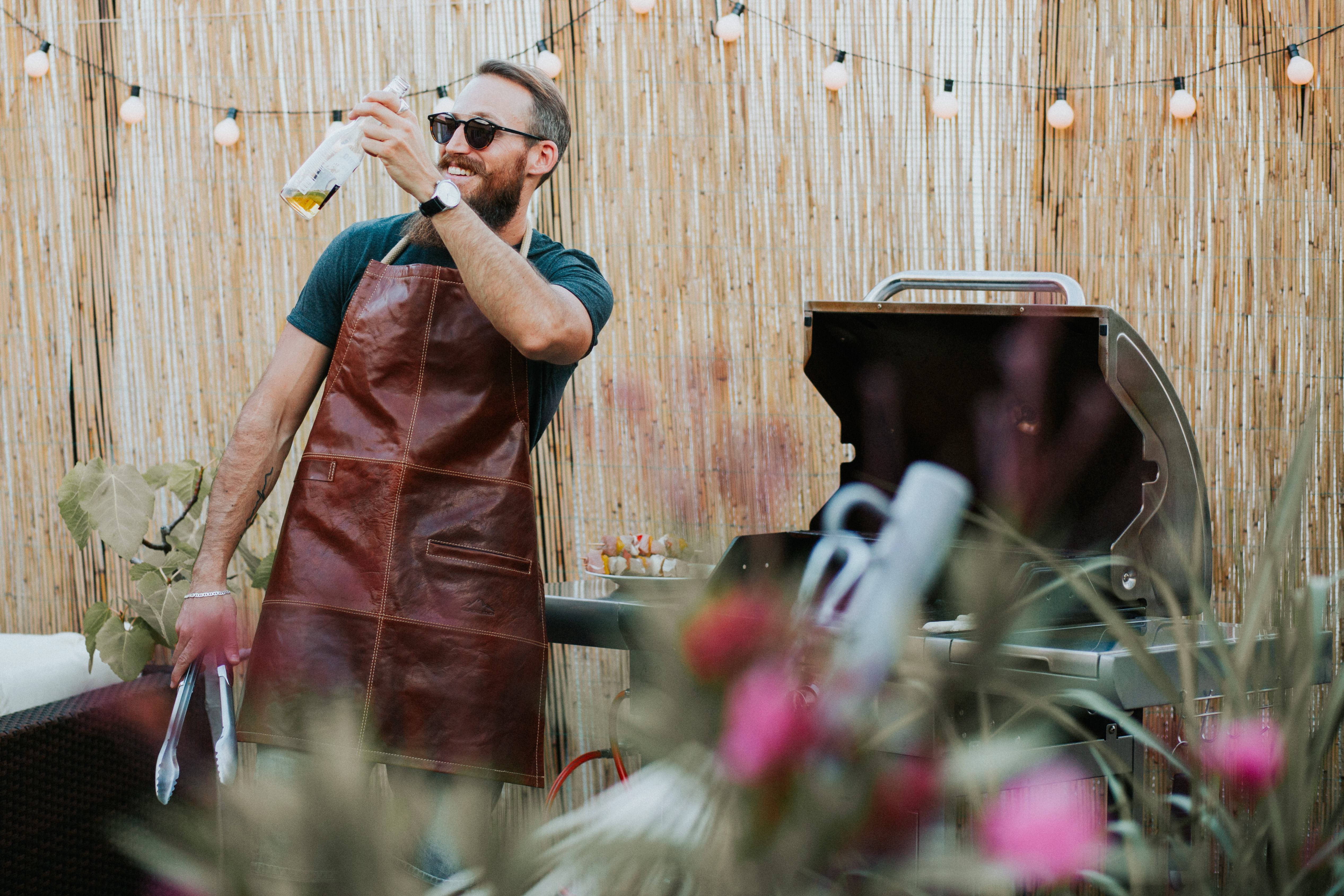 Die Königin unter den Grillschürzen. »FUNKENFEUER« sitzt – dank ihres durchgehenden Kordelsystems – immer perfekt am Körper. Auf der rechten Seite befindet sich eine Tasche, in der Mobiltelefon und Funkthermometer bequem Platz finden. Auf der linken Seite sind zwei Lederlaschen angebracht, um Handtücher oder weitere Grillaccessoires einzuhängen.