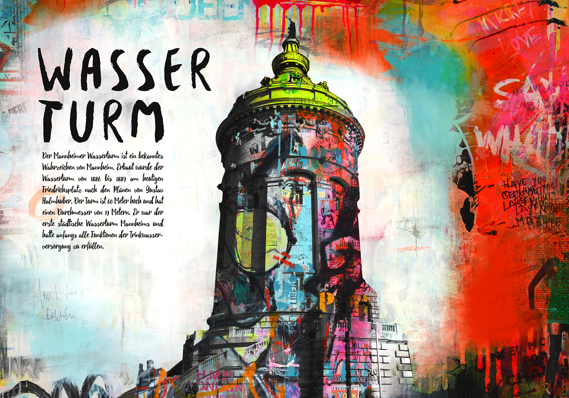 Mannheim Wasserturm | Wandbild. Das Barockschloss aus dem 18. Jahrhundert beherbergt historische Exponate sowie die Universität Mannheim. Auf dem Marktplatz in der streng rasterförmig angelegten Innenstadt, den sogenannten Mannheimer Quadraten, befindet sich ein barockes Brunnendenkmal mit Statuen.