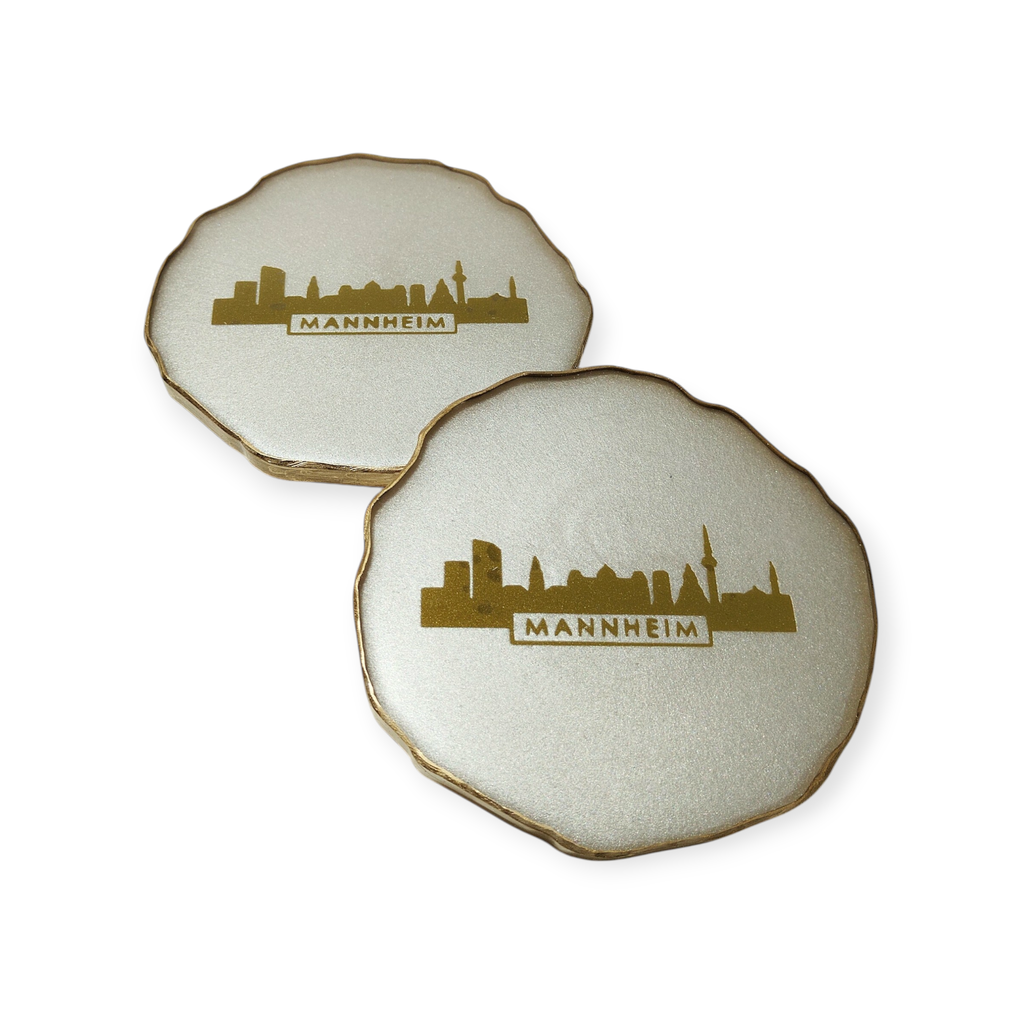 Die Mannheimer Skyline als Untersetzer in einem glanzvollen weiß CARAT PEARL mit unebenem Rand