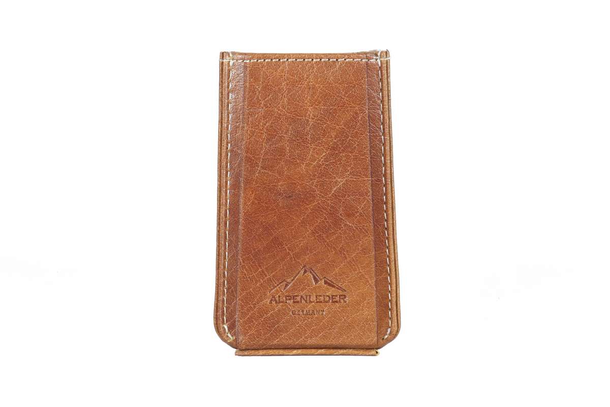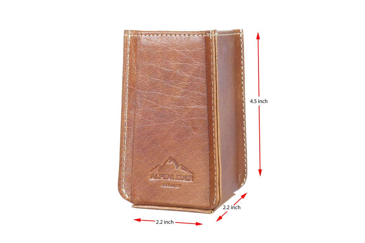 Dieser Artikel wird aus einem Stück Büffelleder gefertigt, allerdings handelt es sich bei der Farbe Cognac um Büffel- Kalbsleder mit einer Stärke von etwa 1,8 mm, das an seiner Oberfläche mit einem Hartwachs von Hand poliert wird und bekommt dadurch seinen unverwechselbaren Charakter. Durch diese Bearbeitung wird jeder Artikel zu einem Unikat.