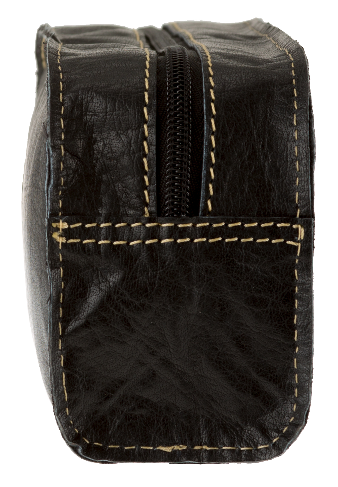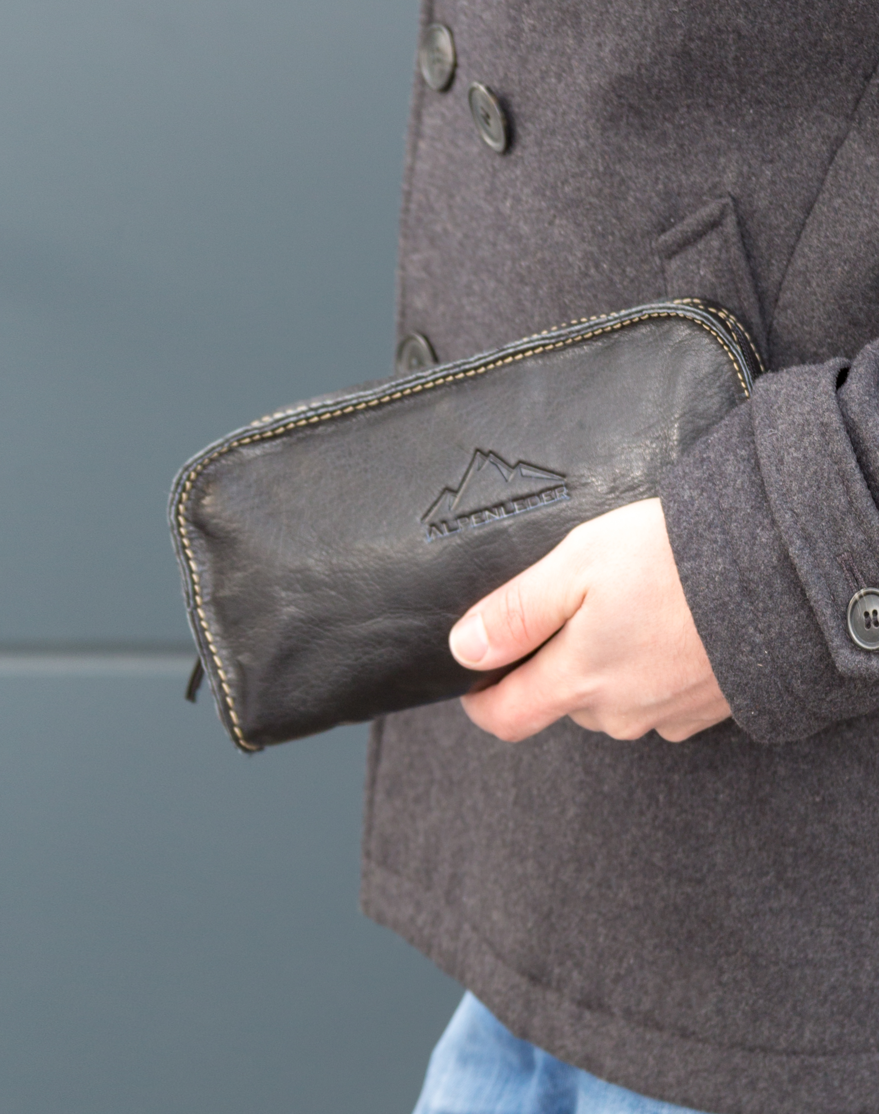 Dieser Artikel wird aus einem Stück Büffelleder gefertigt mit einer Stärke von etwa 1,4/1,8 mm, das nach der vegetabilen Gerbung mit Öl verkocht und danach an seiner Oberfläche mit einem Hartwachs von Hand poliert wird. Durch diese Bearbeitung wird jeder Artikel zu einem Unikat. Die Metallteile an dieser Tasche sind nickelfrei.
